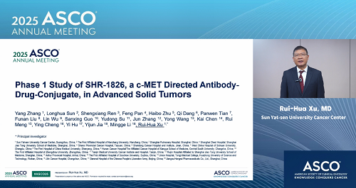 2025年美国临床肿瘤学会(ASCO)年会于5月30日至6月3日在美国芝加哥举行。本次大会,由中山大学肿瘤防治中心徐瑞华教授牵头、918博天娱乐旗舰自主研发的靶向细胞间质上皮转换因子(c-MET)ADC药物SHR-1826的一项I期临床研究入选临床科学研讨会,并由徐瑞华教授口头报告了该研究结果。该研究由43家国内中心共同完成。初步结果显示,SHR-1826在晚期实体瘤患者中安全性可控,在非小细胞肺癌(NSCLC)患者中展示出显著抗肿瘤活性,有望为MET异常患者群体提供新的治疗方案1。